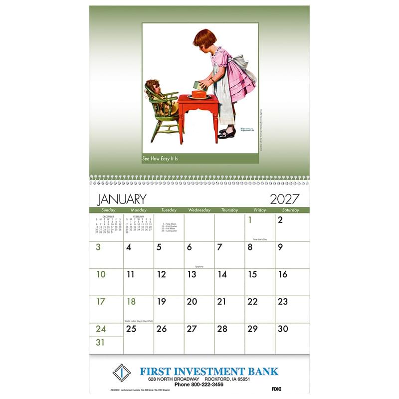 Features thirteen nostalgic art images by American icon Norman Rockwell. Calendar starts with December for early distribution. 13-month, 4-color wall appointment calendar. Great for banks, credit unions, mortgage companies, financial advisors, and more. U.S. Federal holidays and Canadian National holidays are marked.