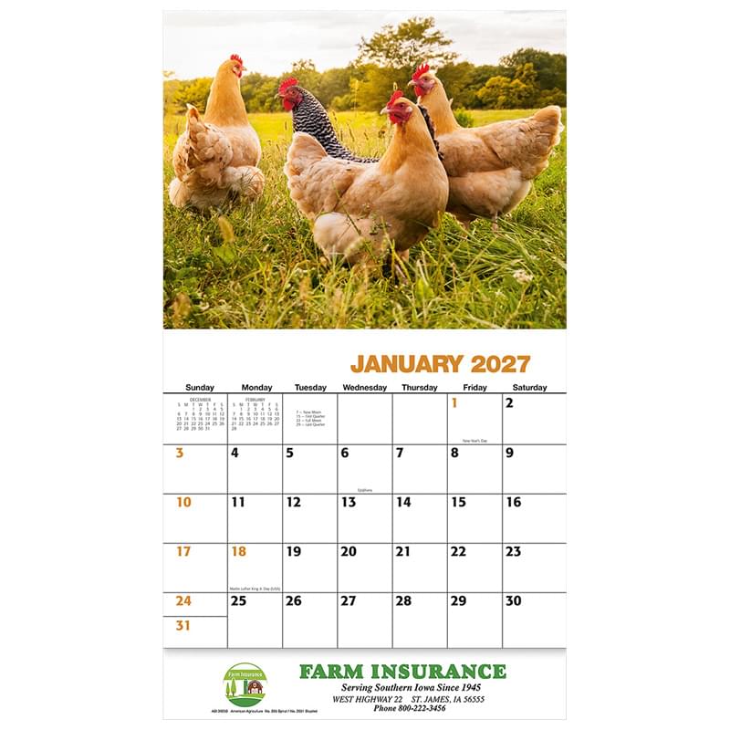 Features thirteen images of rural living including barns, fields of crops and animals. 13-month, 4-color wall appointment calendar. Great for implement dealers, feed and seed stores, food supply, equipment service and repair, and any other agricultural business. The calendar shows U.S. Federal holidays and Canadian National holidays.
