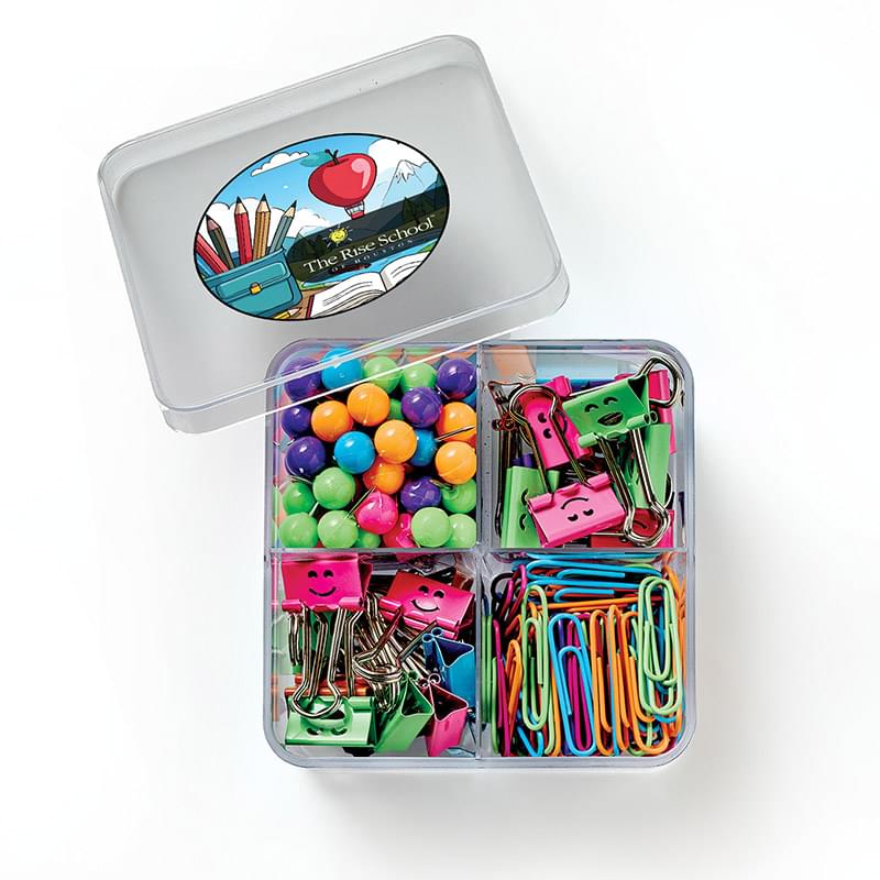 A versatile desktop essentials kit designed for offices, classrooms, planning teams, and everyday organization. Includes 32 binder clips, 100 map pins, and 103 paper clips, each stored in dedicated compartments for quick access. Available in two styles: a bright neon multicolor mix (067-2321) or a classic black-and-white assortment (067-2322). Your logo in full color on a sticker placed prominently on the case. Bulk.