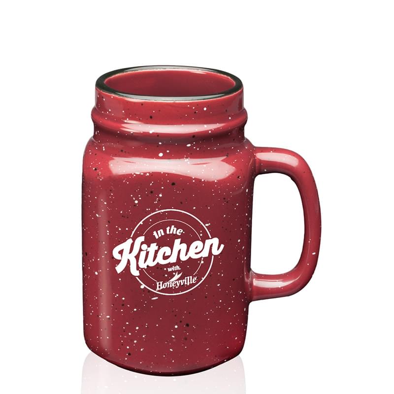 Promote your brand while sipping your favorite beverage from this stylish, speckle-designed Mason jar! This piece of drinkware is made from ceramic material and can hold a capacity of 16 ounces. It measures 5"H x 3"W x 2 1/2" base and can showcase a screen printed or etched company name, logo, event title or whatever your promotional heart desires. Offered in five rich colors, including black, red, white, blue or maroon. Ideal for wedding favors, corporate events, tradeshow giveaways and much more!