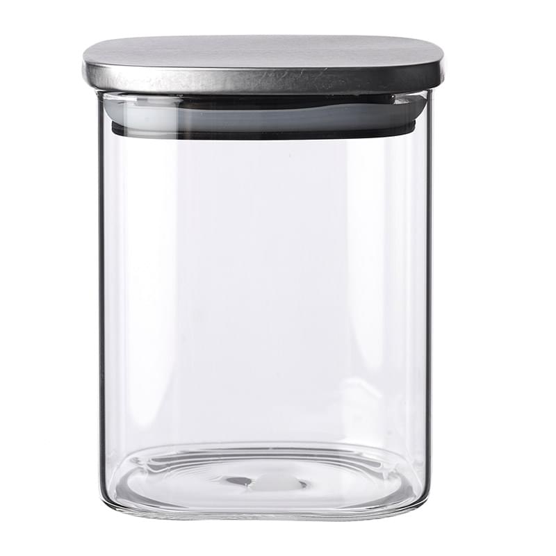 30.4 oz. Square Glass Storage Jars. Airtight Stainless Steel Wrapped Lids Included. Add a Stylish Element To Your Kitchen. Great Promo Item for Cookies and Candies. 3.93" W x 4.72" H