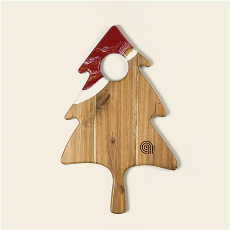 Celebrate the holidays in style with this handcrafted Christmas tree charcuterie board. Use the ingenious dip-holding cutout to hold a small bowl to pair your favorite holiday treats with a tasty accompaniment. Made from acacia hardwood, each piece is truly unique. The woodās natural grain takes center stage, complementing the resin's eco-friendly colors beautifully. Bowl not included.