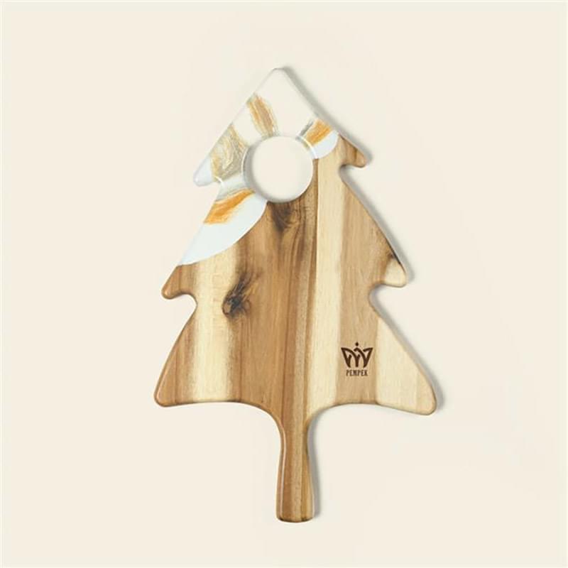 Celebrate the holidays in style with this handcrafted Christmas tree charcuterie board. Use the ingenious dip-holding cutout to hold a small bowl to pair your favorite holiday treats with a tasty accompaniment. Made from acacia hardwood, each piece is truly unique. The woodās natural grain takes center stage, complementing the resin's eco-friendly colors beautifully. Bowl not included.