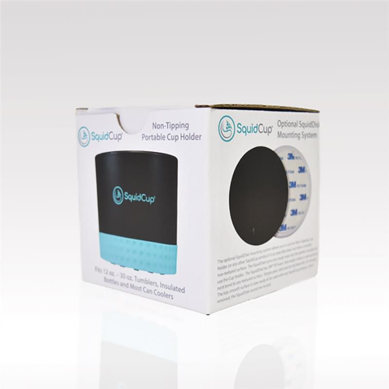 Using Patented technology, this non-tipping cup holder features built-in stabilizers that adjust to securely hold all popular 12oz. -30 oz. bottles and most can coolers, and has premium grade, integrated silicone rubber boot with 20 micro-suction cups for a secure hold. It’s the only non-Tipping Cup Holder with both vertical and horizontal holding power that won’t release! Works on any smooth, non-textured surface, but comes with the optional SquidDisk mounting system, which allows you to use it in an area that does not have a smooth non-textured surface. Light-weight, high-impact ABS Plastic that is BPA-free. Squid Cup logo on backside of cup holder.