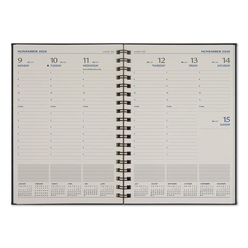 This organic ApPeelĀ® Wireo Academic Planner measures 6 1/2" x 9 1/2". It is made from apple pulp and other vegetable fibers that are ground and emulsified into an organic material with an eco-peel cover. The standard book block is printed of FSC ApPeel paper that starts in July. This planner is bound with standard black wire, and has square corners.