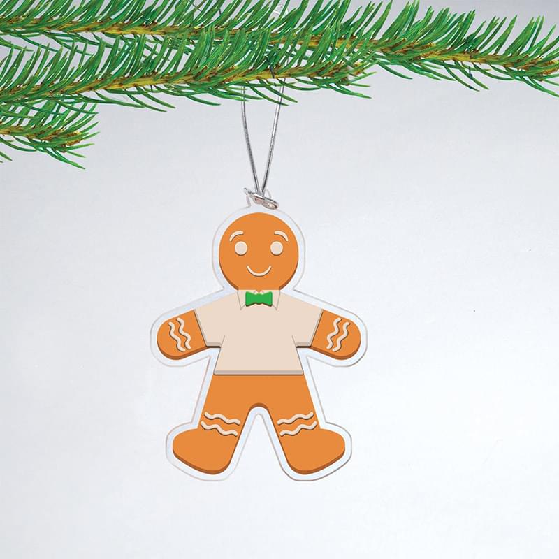 This fun ornament brings you āhome for the holidaysā. Laser cut clear acrylic gingerbread man with 7/8ā imprint area for branding will put a smile on anyoneās face. Includes string (unassembled) and is polybaggedāperfect for gifting.