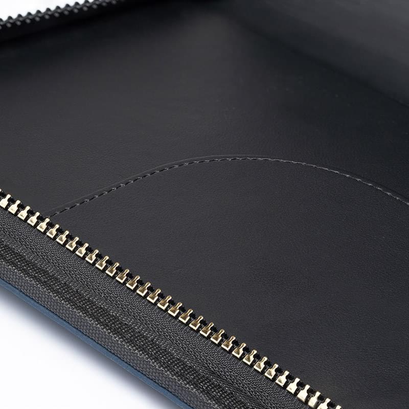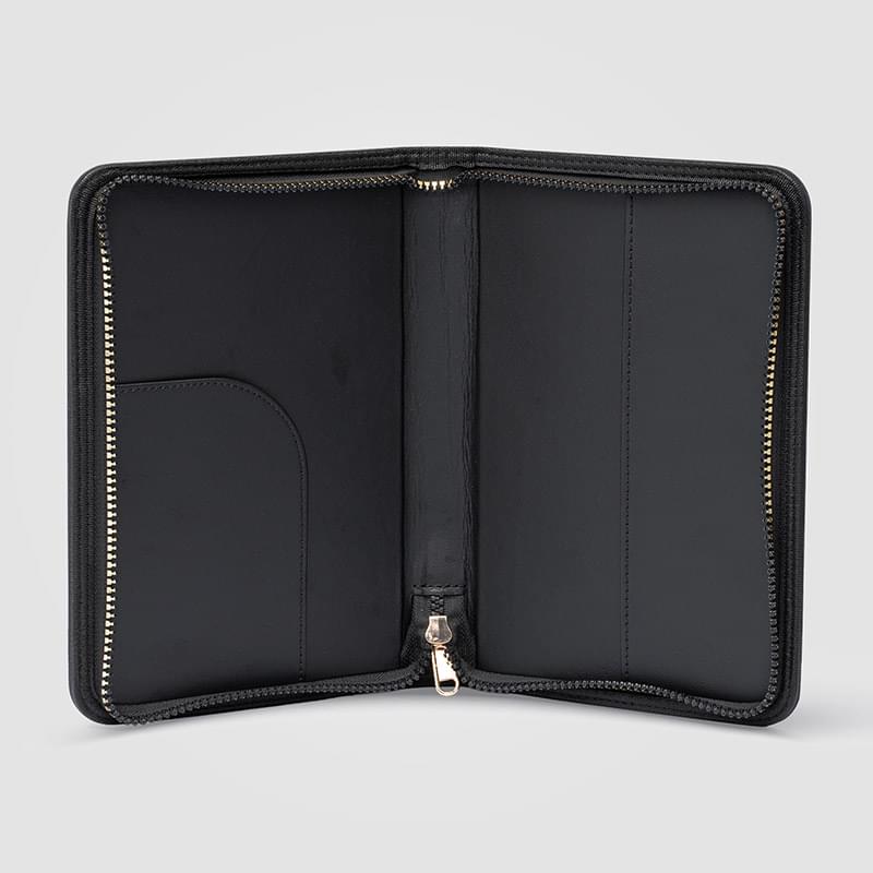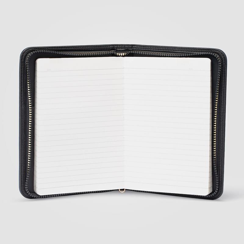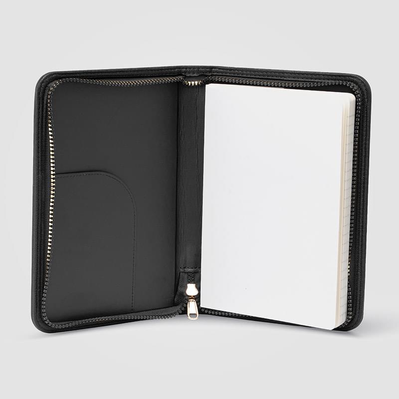 The Aurelia Portfolio is a beautiful, gold-standard accessory designed for organized note-taking. This refillable portfolio's cover is crafted from 50% post-consumer recycled 75D polyester with a sleek black interior, offering a soft yet durable feel. Its standout design feature is the oversized gold zipper with large teeth, which securely fastens the portfolio to match the distinctive style of the Aurelia collection. Functionality is key: the inner structure includes a pocket on the left side of the cover for documents and securely nests an easily replaceable A5 notebook. The notebook features a Kraft card cover and contains 96 sheets of 70gsm FSCĀ® ivory lined paper, ensuring every page supports responsible forestry. With a padded cover providing a robust feel, the Aurelia Portfolio is a highly functional and executive choice.