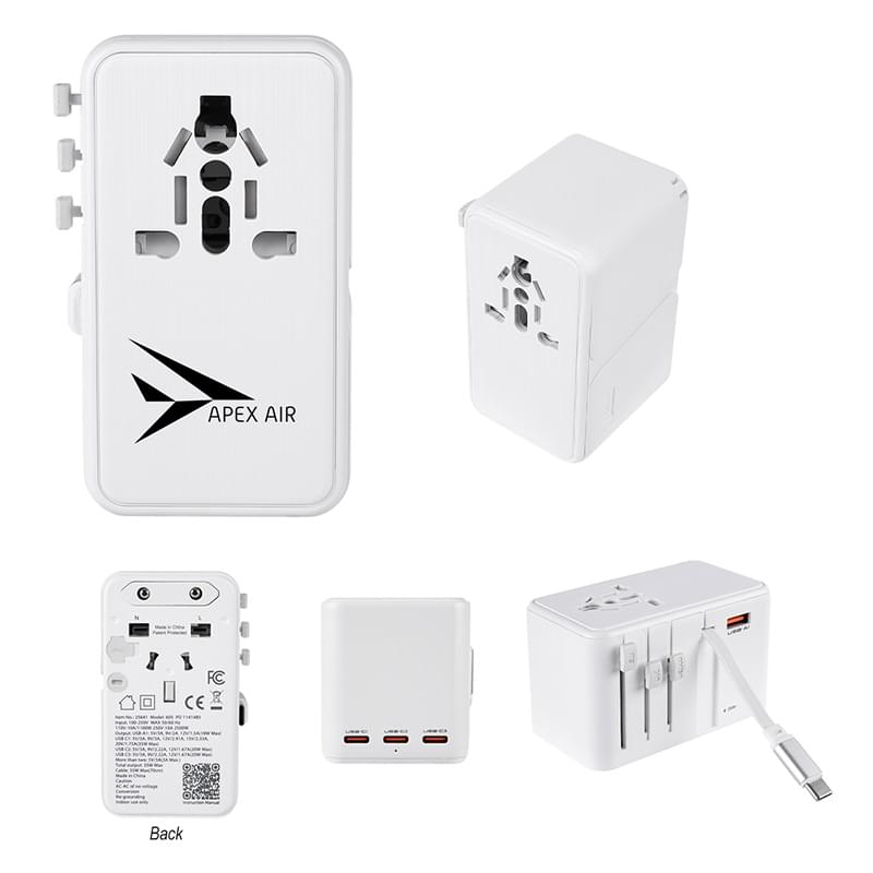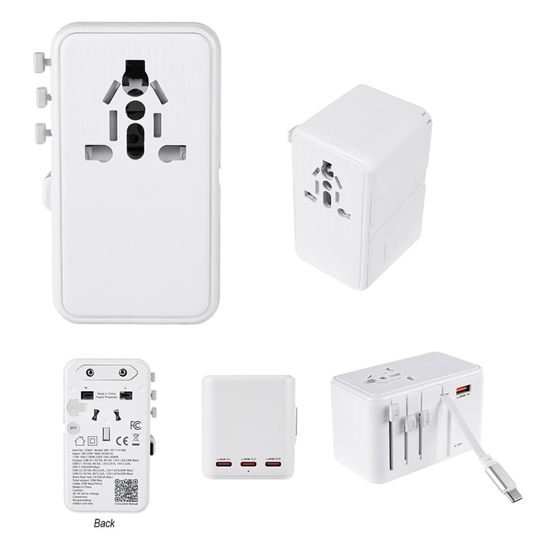 Versatile Power Adapter Compatible With 4 Countries - AUS, EU, UK, USA | Features A USB-A & 3 Type-C Inputs | LED Indicator Light | Retractable Type-C Charging Cable | Output: Up To 35W | Requires Your PhoneĆ¢ā¬ā¢s Charging Cord To Charge Your Device