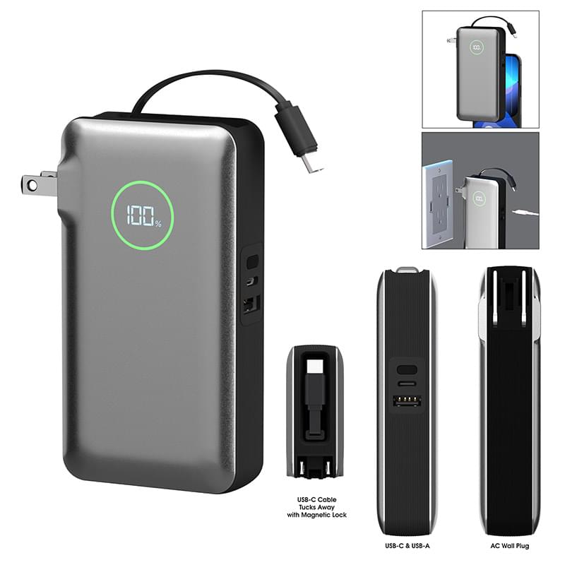 Made Of Polycarbonate Composite | Output: 35W | 10,000 mAh Lithium-Ion Polymer Battery | AC Wall Charger & Portable Battery Pack | Charge Anytime, At Home Or On The Go! | Foldable Wall Charger Design Lets You Charge Your Devices Via Wall Outlet Anywhere You Go  | Pass Through Charging Allows You To Power Up Immediately | Features AC Input And USB-A & USB-C Outputs | Built-In USB-C Cable Tucks Away With Magnetic Lock | Smart LCD Display | Features A Type-C Input (Cord Included) | Compatible With iPhone 17/16/15/14/13/12, AirPods & More | Apple, iPhone, and AirPods are trademarks of Apple Inc., registered in the U.S. and other countries.