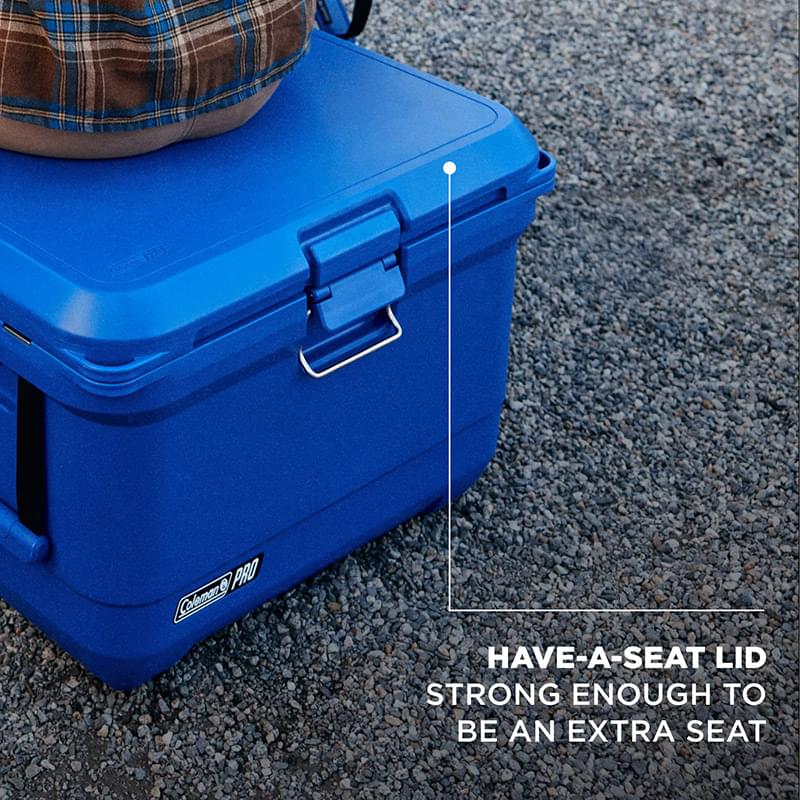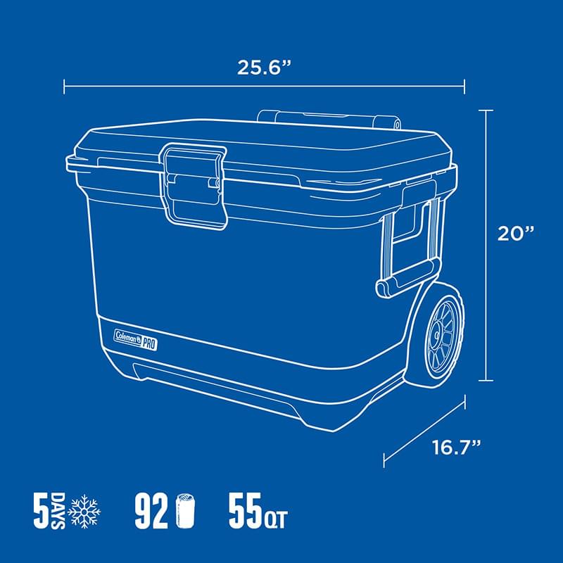 Built for long days and big gatherings, the ColemanĀ® Pro-Series 55-Quart Wheeled Hard Cooler delivers reliable performance wherever the fun takes you. Its fully insulated lid and body feature extra-thick walls up to 2" wide to help keep contents cold for up to five days. Rugged wheels and an extendable handle make it easy to roll from the backyard to the beach. The spacious interior holds up to 92 cans (without ice), and the Have-A-Seat⢠lid doubles as extra seating when you need room for one more. Finished with a steel latch, oversized drain plug, padlock-compatible design, and nonslip feet, itās ready for your next big event or weekend away.