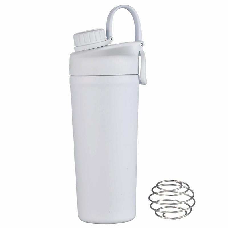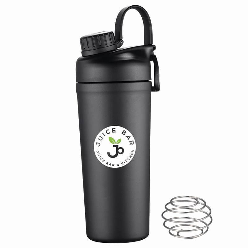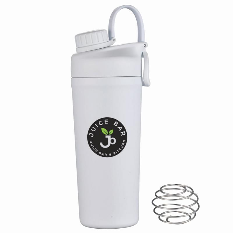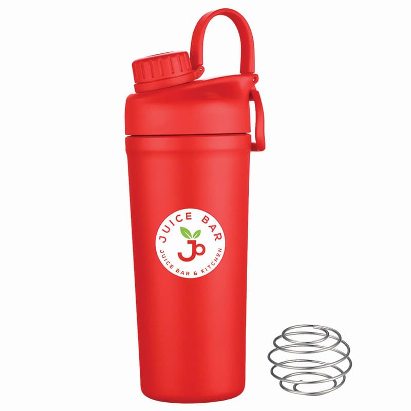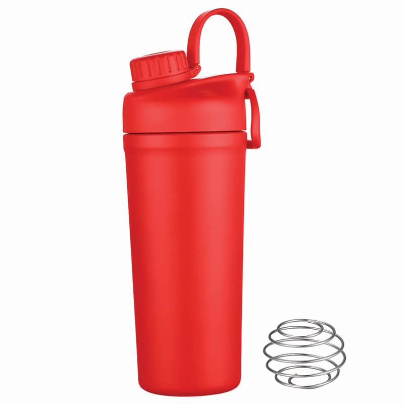 Mix and go with the Shaker Bottle with Stainless Steel Agitator. The included whisk blender ball increases the speed of blending ingredients like protein powder or infusing fresh fruit into the liquid. The double wall insulation keeps drinks hot or cold. Features a leakproof screw off cap for the drinking spout and the main lid screws off to easily add contents. BPA Free, Lead Free and FDA Compliant.